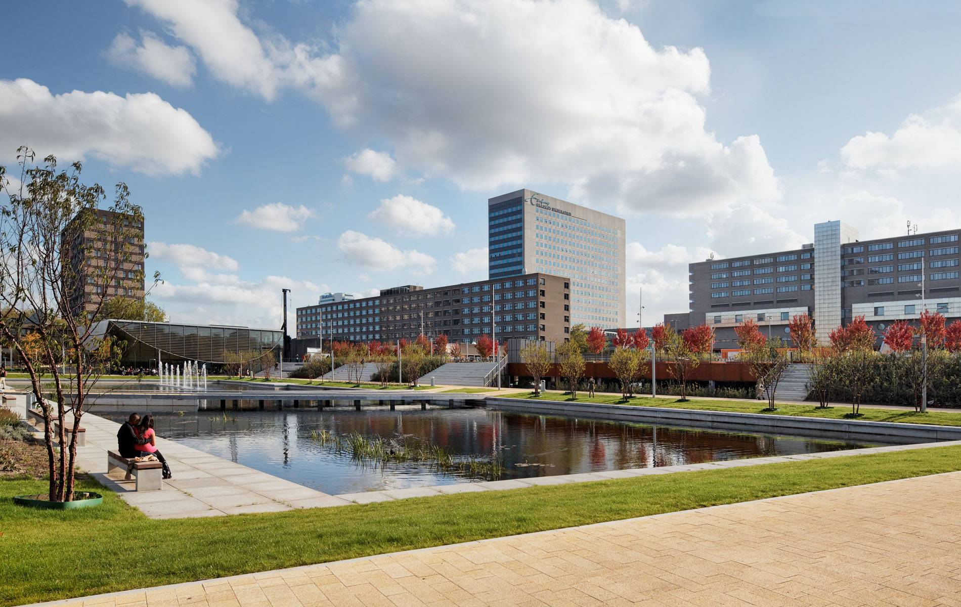 The Erasmus university will enhance its (inter)national exposure and flair and robustness towards the future, through the entire redevelopment of its Woudestein campus, in Rotterdam. A new program will be incorporated including student housing, a student pavilion, student facilities and study spaces and faculties. The current campus complex is a legacy of the 1960’s and subsequent years of short term planning. With this master plan operation, the campus will realize a qualitative jump, by incorporating global success factors onto the campus. New clear main entrances, a transparent internal spatial organization, a car-free redesigned outside space, a large half sunk parking garage, a new water body are just a few elements of the integrated new master plan that will reshape the face of the campus in the coming years.